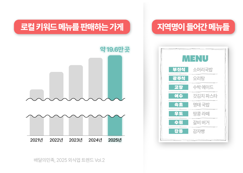 지역명이 들어간 메뉴를 판매하는 매장은 2024~2025년 들어 대폭 증가했습니다. 소비자들은 지역 정체성이 담긴 메뉴를 주문할 때 현지에서 맛본 추억을 떠올리고, 이는 자연스럽게 감각 소비와 경험 소비로 이어지거든요.