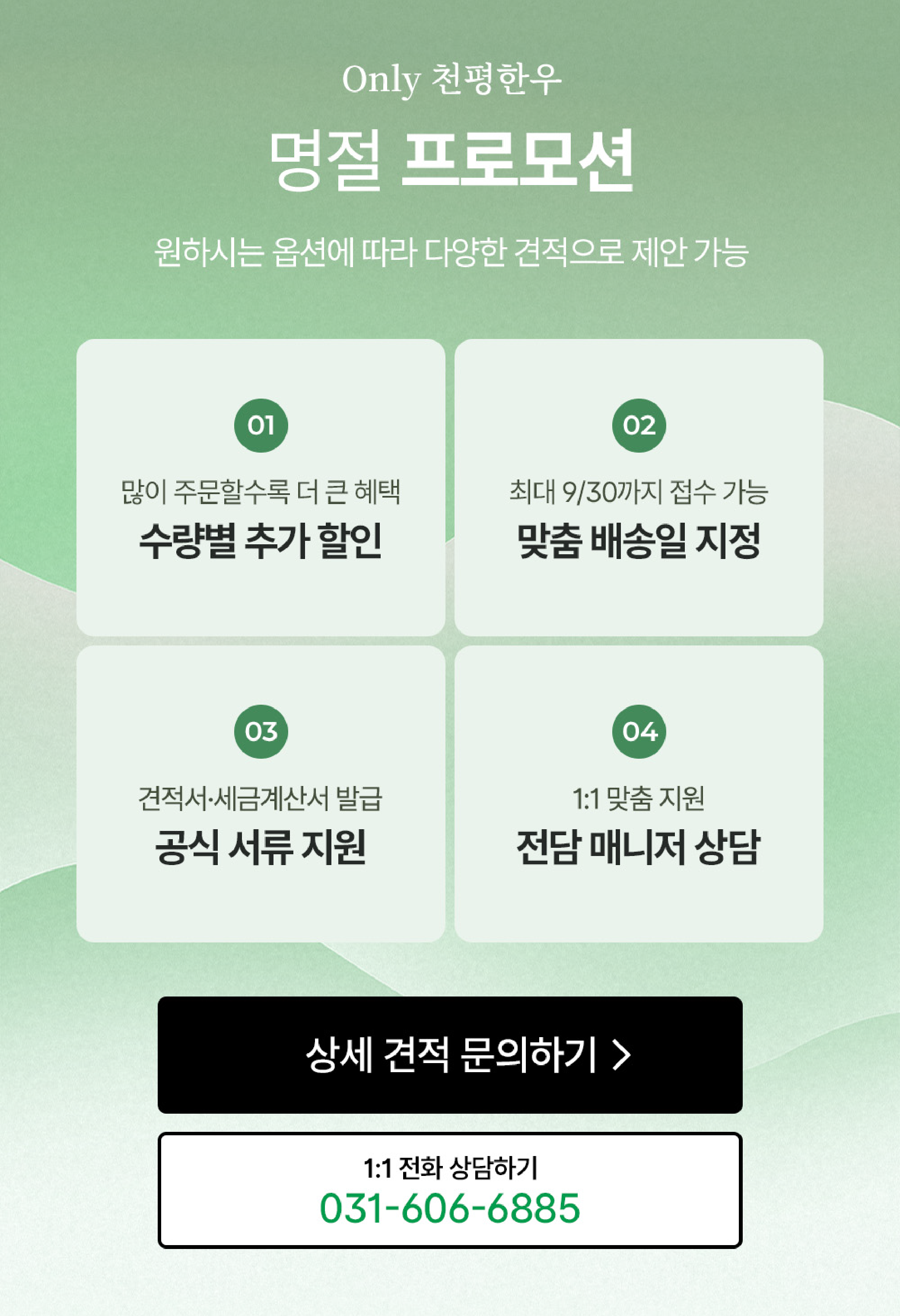 임직원 만족도를 높이고, 고객사와의 관계를 돈독히 하는 이번 프로모션을 통해 한 차원 높은 명절 선물을 경험해 보시기 바랍니다.