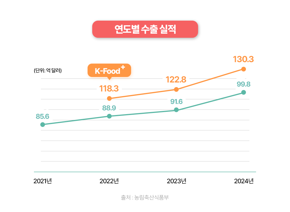 한식은 세계 미식의 중심지에서도 당당히 인정받고 있습니다. 뉴욕타임스가 발표한 ‘2024 뉴욕 최고의 레스토랑 100곳’에 7개의 한식당이 이름을 올렸는데요. 이를 증명하듯, 2024년 K-푸드 플러스 수출액은 130억 달러(한화 약 17조 9,400억 원)를 돌파하며 역대 최고치를 기록했습니다. 농식품 수출 1위 품목인 라면은 드라마, 영화 등 K-콘텐츠에 자주 노출되고 라면먹기 챌린지가 유행하면서 권역별 고른 성장세를 보였는데요. 특히 미국에서는 텍사스의 대형 유통매장 신규 입점에 성공하면서 수출이 70% 이상 증가했다고 해요.