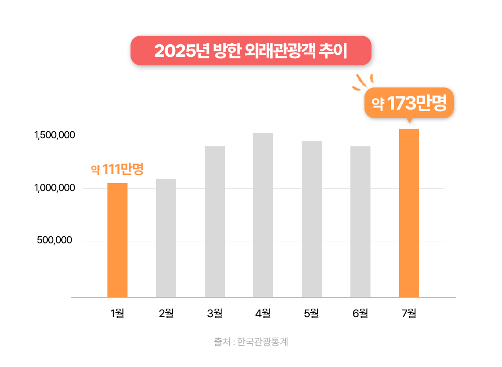 글로벌 열풍은 국내 외식업 시장에도 직결됩니다. 2025년 7월, 방한 외국인 관광객 수는 173만 명을 기록하며 코로나 이전 수준의 119.7%까지 회복했습니다. 핵심은 단순한 회복이 아니라, 외국인 관광객이 한국을 찾는 목적 자체가 달라졌다는 점입니다. 과거에는 관광지가 중심이었다면, 지금은 음식이 여행의 이유가 되고 있습니다.
