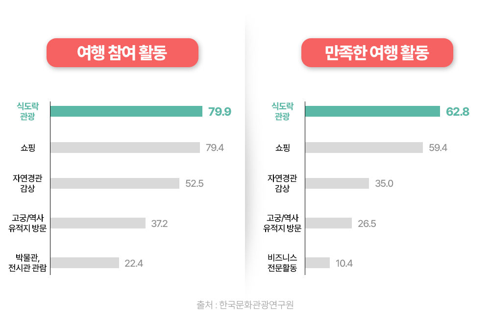 또한 한국문화관광연구원의 <2025 외래관광객조사 2분기 잠정치 보고서>에 따르면 한국 방문 기간 동안 참여한 활동은 ‘식도락 관광’(79.9%)이 1순위로 가장 높게 나타났습니다. ‘만족한 여행 활동’ 항목에서도 식도락 관광은 2025년 매월 가장 높은 비율을 보였죠.