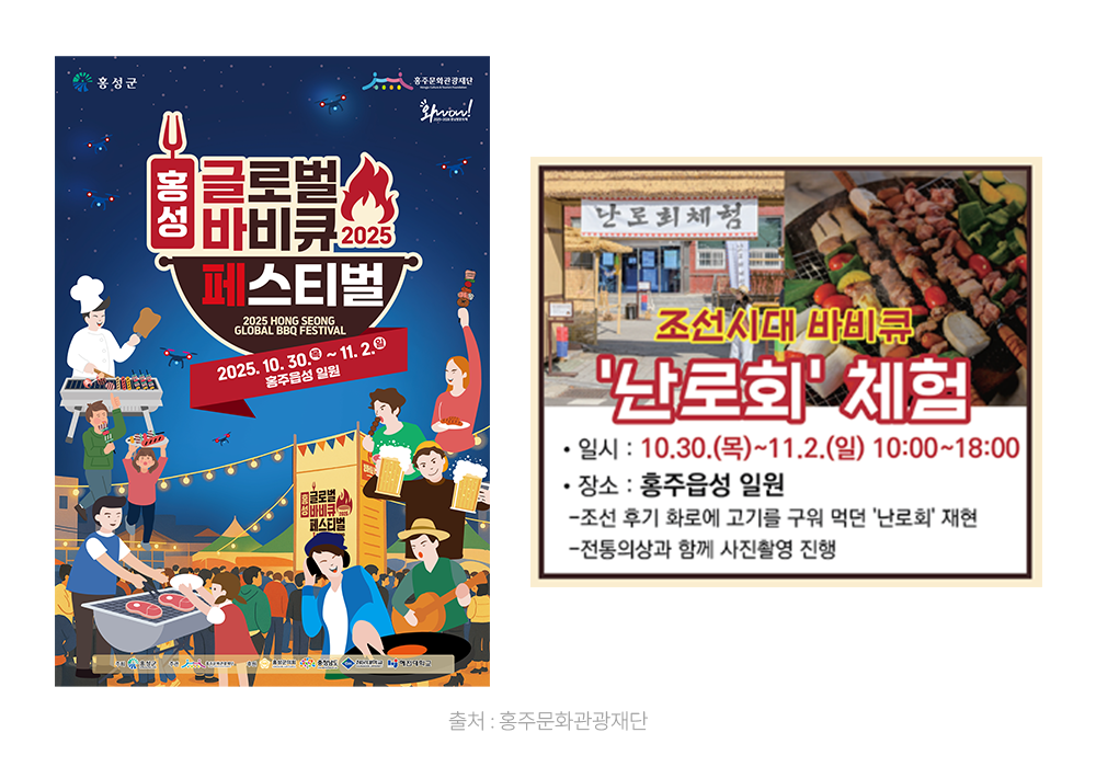 오는 10월 30일부터 홍성에서 열리는 <글로벌 바비큐 페스티벌>은 지난해 55만 명이 찾을 만큼 인기를 끌었고, 올해는 글로벌 테마존을 확대해 세계 각국의 바비큐와 한국식 삼겹살을 함께 즐길 수 있는 자리로 준비되고 있습니다. 특히, 조선 후기 화로에 고기를 구워 먹던 전통 방식을 재현하는 ‘난로회 체험’이 흥미로운데요. 전통의상과 함께 사진 촬영도 진행돼 관광객들에게 색다른 K-BBQ 경험을 제공할 예정입니다.